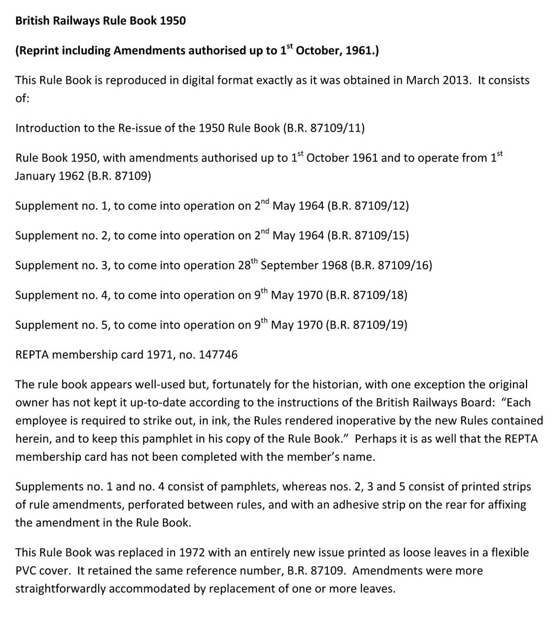 NEW APR 2013. Copies of this rule book are not uncommon, but unusually this one despite seeing service did not have the later replacement amendments inserted as instructed. Instead, these amendments - sometimes in the form of perforated gummed strips - feature separately as five supplements at the end of the file. The final page of the file shows the (unnamed) owner's REPTA (British Transport Employees' Association) membership card for 1971, issued at March.