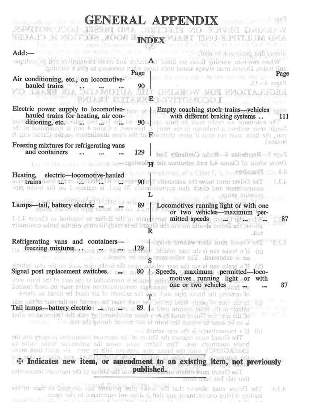 The General Appendix itself amplifies the Railway's Rule Book - it applies it to specific routines, and also describes the correct way to use new equipment. A new edition of the General Appendix was produced regularly, perhaps annually. In the meantime a series of cumulative supplements - four seemed to be usual - came out to provide updates. Some items were to be deleted and some amended, while many items were new. To see the changes to be made to the index to this supplement, click here.