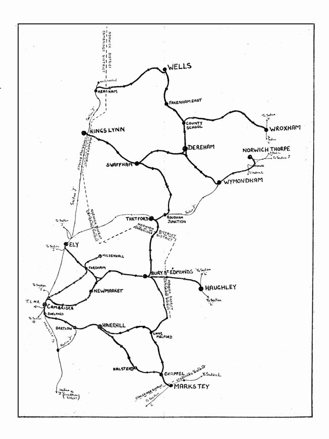 NEW DEC 2011, REVISED AUG 2012. September 1953, both passenger and freight. Click here to see a map of the coverage. Includes the branches from Cambridge to Marks Tey and Mildenhall; from Haughley to Cambridge and Ely; from Thetford to Bury, Long Melford and Swaffham; and from Dereham to Lynn, Wells and Heacham, Wroxham and Wymondham. Comprises 36 pages of working timetables, followed by 24 pages of amendments to Sections J, K and L dated 2 November 1953 (including BAOR trains and provision for the herring and sugar beet seasons).
