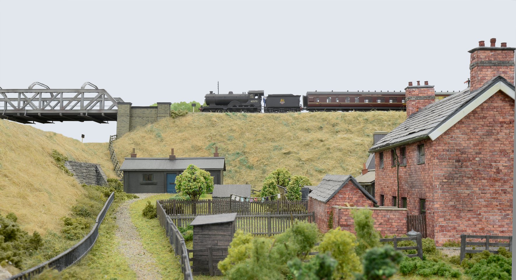 Class D16/3 62573 heads westwards at Little Bytham and is about to cross the ECML by the substantial girder bridge. It’s on a Kings Lynn-Nottingham three-set, comprising of ex LMS-carriages, BTK, CK, BTK. The loco is built from a Mallard kit (latterly Blacksmith), and represents the type still retaining the decorative valancing. I built/painted it and Geoff Haynes weathered it. The semis to the right still stand (much extended) though the wooden dwellings were demolished by the ‘60s. D16s used to work from East Anglia to the East Midlands’ cities. After the M&GNR closed in February 1959, the survivors worked over the Midland line through Stamford.