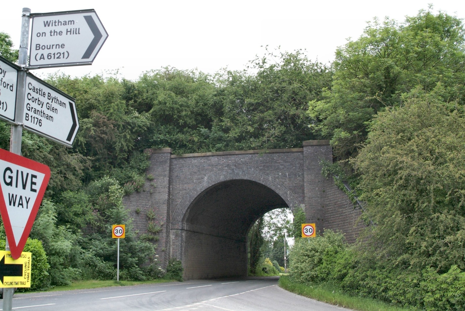 The same PDK B12/3 seen in the last shot now has charge of the westbound ‘Leicester’, the line’s principal train. It was also the only M&GNR service which had a catering vehicle (attached/detached at South Lynn). I built this catering car from a D&S kit. The real thing had started life pre-WW1 as a GE Restaurant First, of which a few were built. The LNER rebuilt them (downgrading them to RUs) and BR re-rebuilt one or two, in this case into a Buffet Car. It would have been attached to the rear of the train at South Lynn, but, after the set reversed at Spalding, it then ended up at the front. In the last year or two of the line’s existence, it ran all the way through to/from Cromer. An overbridge (which still stands) takes a private road from Little Bytham to Lord Willoughby’s ancestral pile of Grimsthorpe Castle.
