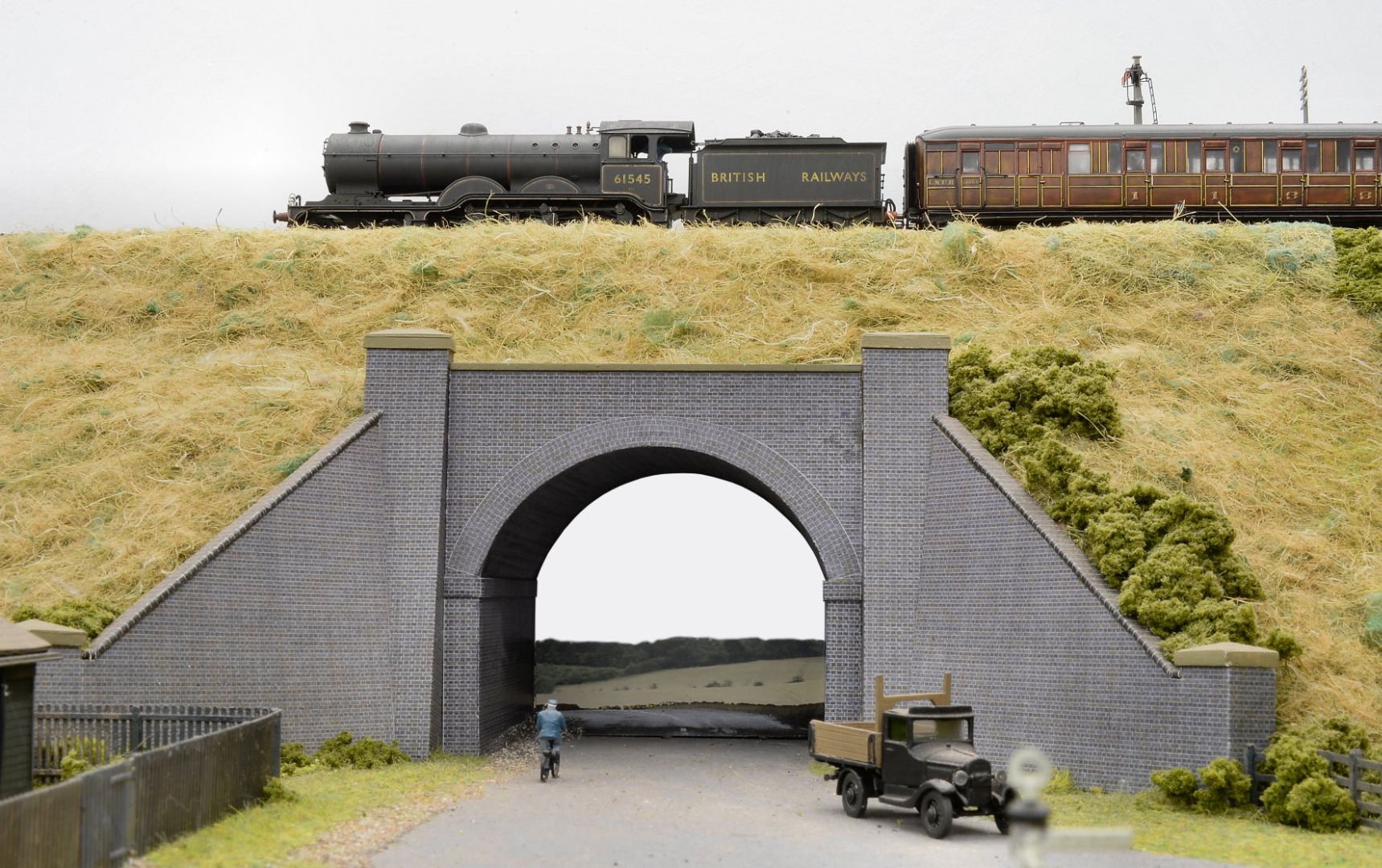 The same altered Hornby B12/3 is seen heading westwards this time, crossing the substantial ‘tunnel’ bridge spanning Station Road at Little Bytham. This wonderful structure fortunately still stands in reality, though trains haven’t crossed over it for 62 years! This time the train is composed of LNER cars, still in teak. Though the main line depiction on Little Bytham represents 1958, I’m much more fluid with regard to the time represented on the east-west route; that’s the last decade of the line’s existence, from Nationalisation to closure.