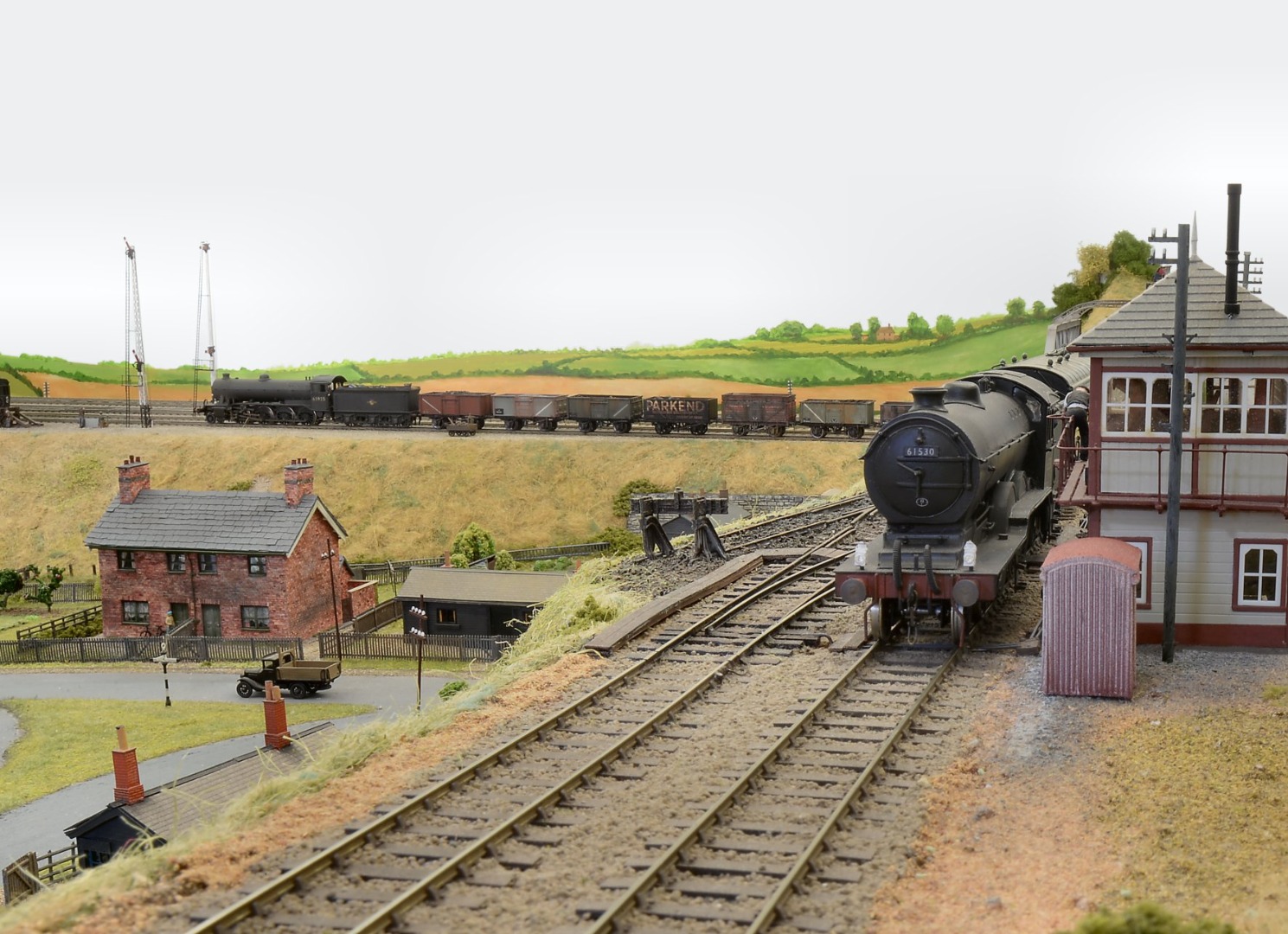 Class B12/3 61530 heads eastwards towards Bourne on an express from Leicester to Cromer. I built the loco from a PDK kit, and Ian Rathbone painted it. Several B12s were allocated to M&GNR sheds in the ‘50s and this is one. A full coal rake plods southwards on the ECML’s Up slow behind an O2/4 which I built from another PDK kit. The railway semis (now privately-owned) were built by Bob Dawson.