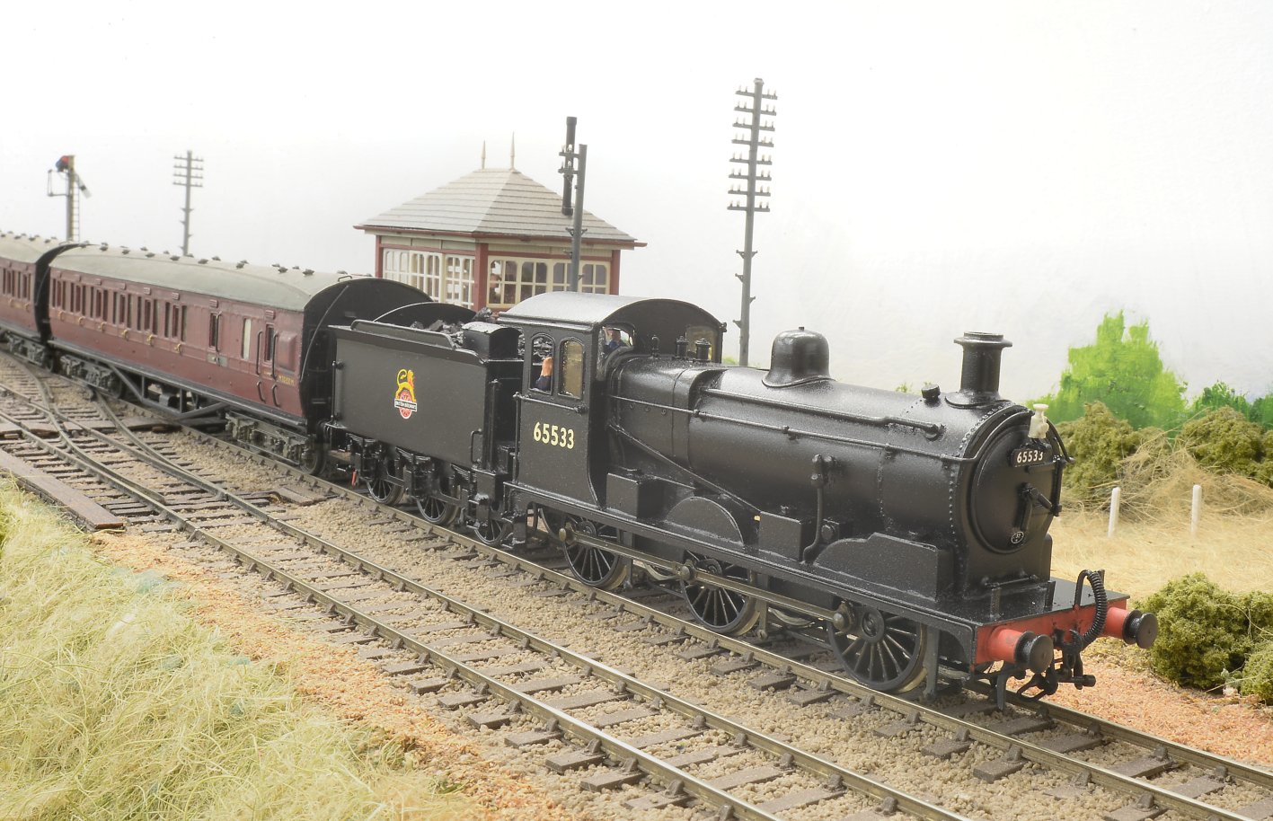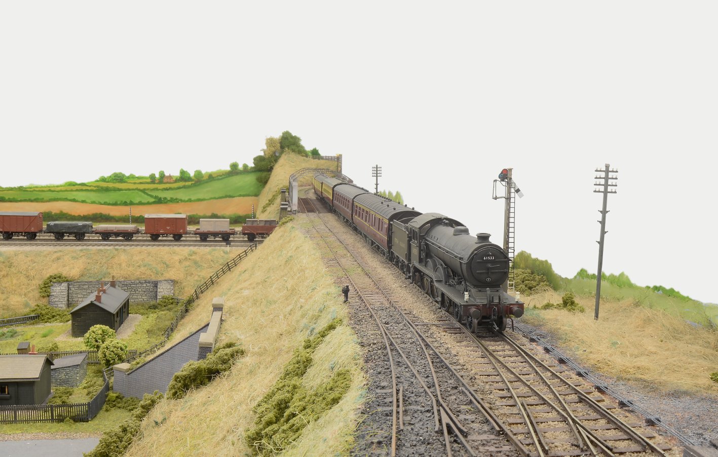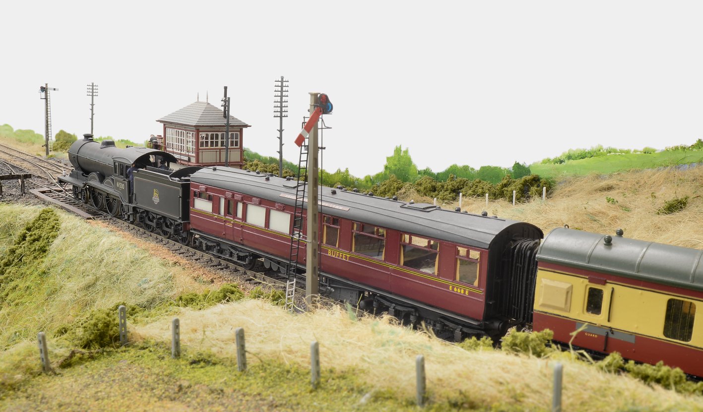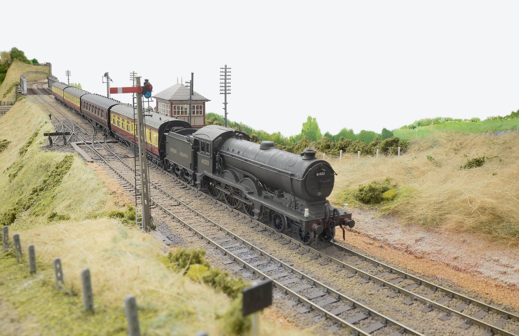 I must admit that I have no evidence that one of Cambridge’s ‘Royal Clauds’ ever ran on the M&GNR, but I think this makes a pretty picture. It’s representative of the loco post-Nationalisation, but still retaining LNER livery. I modified/detailed/renumbered this Hornby RTR product and Geoff Haynes weathered it. The Midland-style lower quadrant signals were built by Tony Gee.